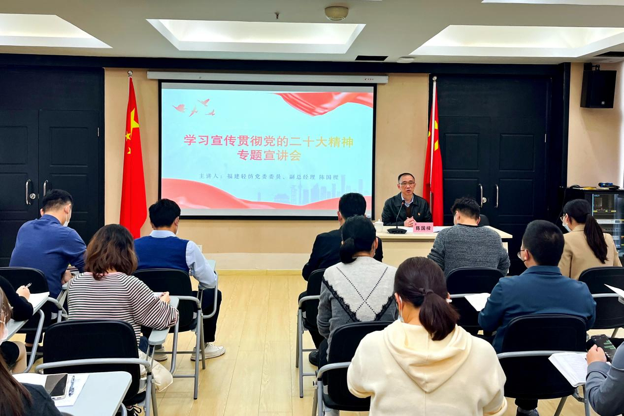 12月9日,福建輕紡黨委委員、副總經理陳國樑到金皇環保宣講黨的二十大精神。金皇環保公司領導班子成員、全體黨員和入黨積極分子共60人參加宣講會。