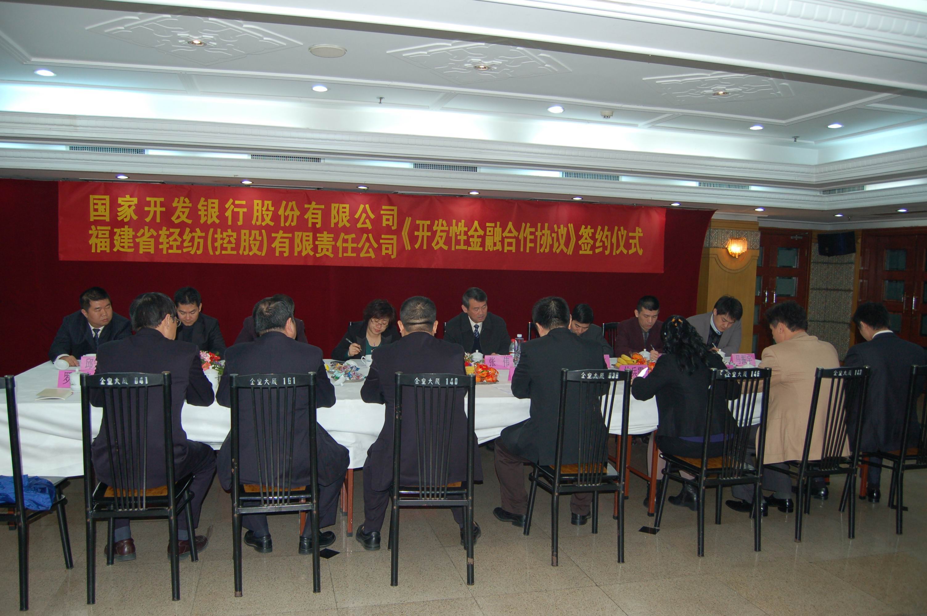 12月24日,福建省輕紡(控股)有限責任公司與國家開發銀行簽訂《開發性金融合作協議》。國家開發行福建分行行長張偉、副行長曾麗卿、福建省輕紡(控股)有限責任公司總經理鄭震、副總經理黃國英出席了出席了簽約儀式。簽約儀式由黃國英副總經理主持。