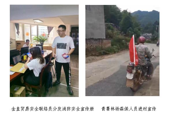 四是敲門入戶送平安。金皇貿易公司安全聯絡員逐一上門,為大廈內承租戶分發消防安全宣傳冊,增強承租戶防火安全意識,提高自防自救能力。權屬企業漳平青菁林場通過發放宣傳單,小喇叭播放森林防火知識、森保人員進村入戶開展森林防火法律法規宣傳等方式,向廣大群眾進行消防安全知識宣傳,進一步提高廣大群眾在森林防火、安全用火、安全避火等方面的常識和技能。
