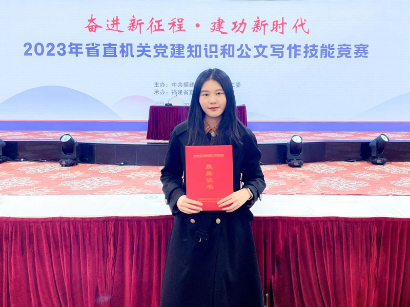 12月7日,福建省直機關工會工委“奮進新征程 建功新時代”2023年省直機關黨建知識和公文寫作技能競賽頒獎典禮舉行,福建省輕紡(控股)有限責任公司機關工會第二小組成員、紀委綜合室主辦楊文嘉同志榮獲一等獎。