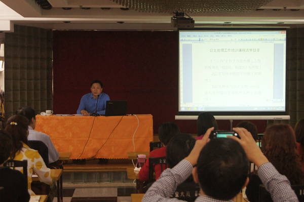 11月25日上午,省輕紡控股公司召開公文寫作保密工作規范培訓班,控股公司本部員工及各權屬企業分管文秘工作負責人、黨政辦負責人及業務骨干共90人參加培訓,培訓班邀請劉文森老師給大家授課。通過劉文森老師對公文寫作深入淺出的講解和案例分析,提高了參訓人員對各類公文寫作和保密工作規范的認識,進一步掌握了公文寫作方法和技巧,培訓效果良好。