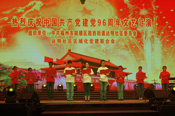 6月28日,福州市鼓西街道達(dá)明社區(qū)區(qū)域化黨建聯(lián)合會“慶祝建黨96周年文藝匯演”在福州榕城大劇院舉行。