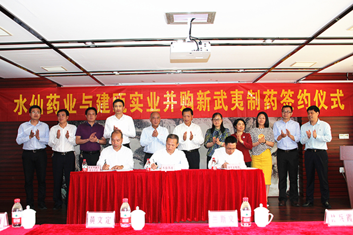 水仙藥業(yè)董事長(zhǎng)林建平、建甌實(shí)業(yè)集團(tuán)董事長(zhǎng)翁瑞貴與新武夷制藥原股東代表鄭寶康分別代表三方簽署并購(gòu)協(xié)議,一紙協(xié)議書標(biāo)志著福建輕紡在產(chǎn)業(yè)轉(zhuǎn)型、藥業(yè)布局上邁出了重要一步。