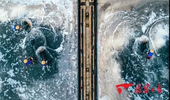 在寒冷的冬季,晶核容易黏附在池底,降低結晶速度,為了使結晶顆粒均勻,提高晶體的純度,鹽工們得冒著嚴寒進行多次旋鹽和翻動鹽粒,這樣產出的鹽才能達到顆料均勻、粒度適宜,成品就可直接用于包裝成小包裝食鹽,真正做到原生態、純天然、全手工。