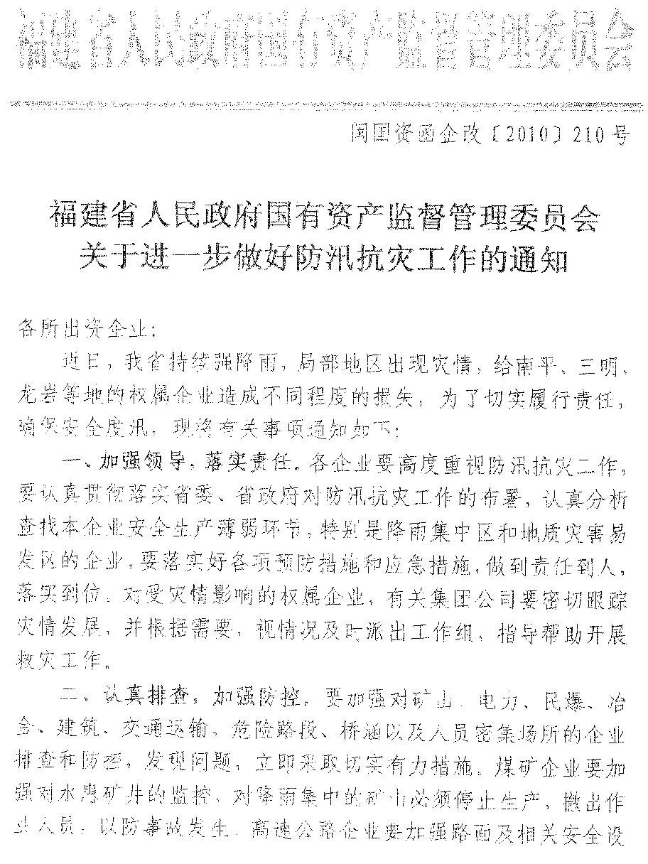 現(xiàn)將《福建省人民政府國有資產(chǎn)監(jiān)督管理委員會(huì)關(guān)于進(jìn)一步做好防汛抗災(zāi)工作的通知》(閩國資函企改〔2010〕210號)轉(zhuǎn)發(fā)給你們。結(jié)合我司企業(yè)實(shí)際,提出如下要求,一并貫徹落實(shí)。