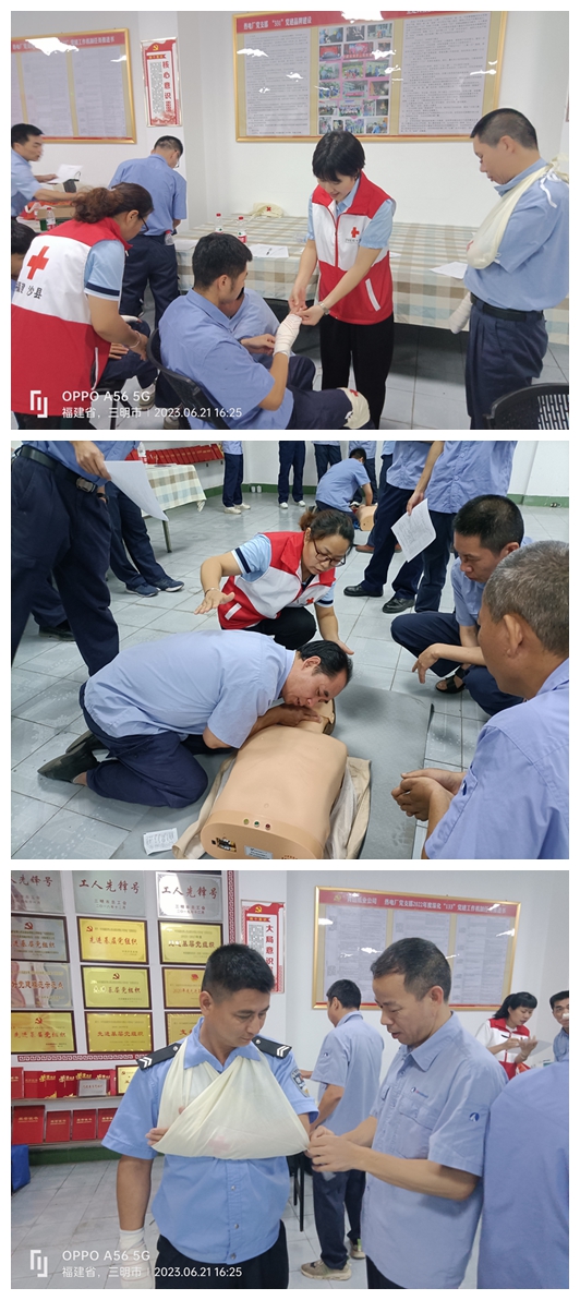 本期培訓分為線上理論培訓和線下實操培訓。在學員們順利完成了線上理論培訓課程后,公司于6月21日邀請沙縣區紅十字會常務副會長樂梅金等3位應急救護師開設“沙縣區2023年為民辦實事項目——救護員培訓班”。老師們多年深入學校、企業、社區從事應急救護知識宣傳,擁有豐富的應急救護經驗,為學員們認真培訓了“心肺復蘇術操作(CPR+AED)”“氣道異物梗阻處置”“ 繃帶包扎”和“三角巾包扎”等急救技能。