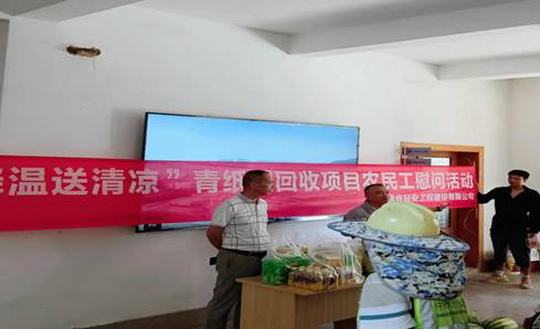 在青紙堿回收項目和連坂污水處理廠三期工程慰問現場,工會主席程秀林為一線工人發放藿香正氣水、十滴水、清涼油、西瓜等防暑降溫慰問品,為奮戰在一線的員工送去關懷,感謝他們在烈日下的堅守和奉獻。