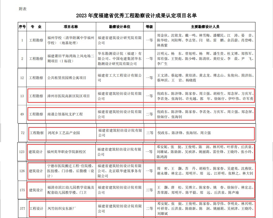 近日,福建省勘察設計協會官網公布了“2023年度福建省優秀工程勘察設計成果認定評選結果公示”。輕紡設計院共有7個項目獲獎,其中:優秀建筑工程設計一等獎2項、三等獎1項;優秀工程設計二等獎1項;優秀工程勘察一等獎1項、二等獎1項、三等獎1項。