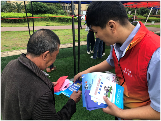 保衛(wèi)處工作人員在發(fā)放反詐告知書、反詐宣傳單